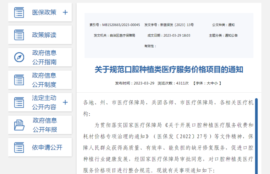 曾经,种植牙高昂的费用让许多人望而却步。但现在,情况有了大变化!2023 年起,新疆紧跟国家步伐,依据《关于开展口腔种植医疗服务收费和耗材价格专项治理的通知》等文件精神,开展口腔种植医疗服务收费和耗材价格专项治理,通过 “三位一体” 的综合施策,让种植牙价格回归合理区间。