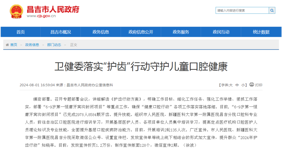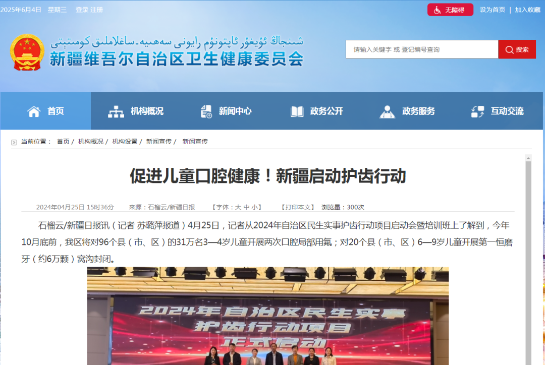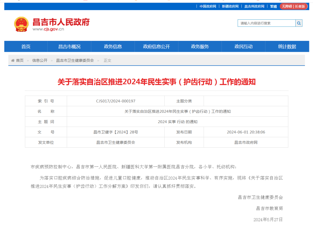 口腔健康是全身健康的重要基础,新疆在儿童口腔健康方面同样下足了功夫。2024 年,自治区卫生健康委、教育厅、财政厅、疾病预防控制局联合印发《关于印发自治区推进 2024 年民生实事(护齿行动)工作方案的通知》,在全区范围内启动护齿行动 。