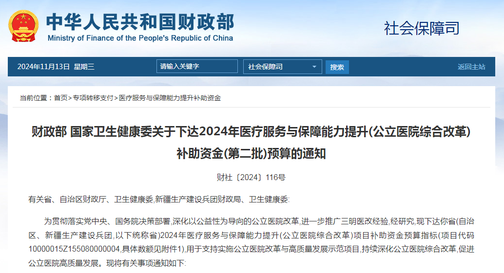 财政部 国家卫生健康委关于下达2024年医疗服务与保障能力提升(公立医院综合改革)补助资金(第二批)预算的通知